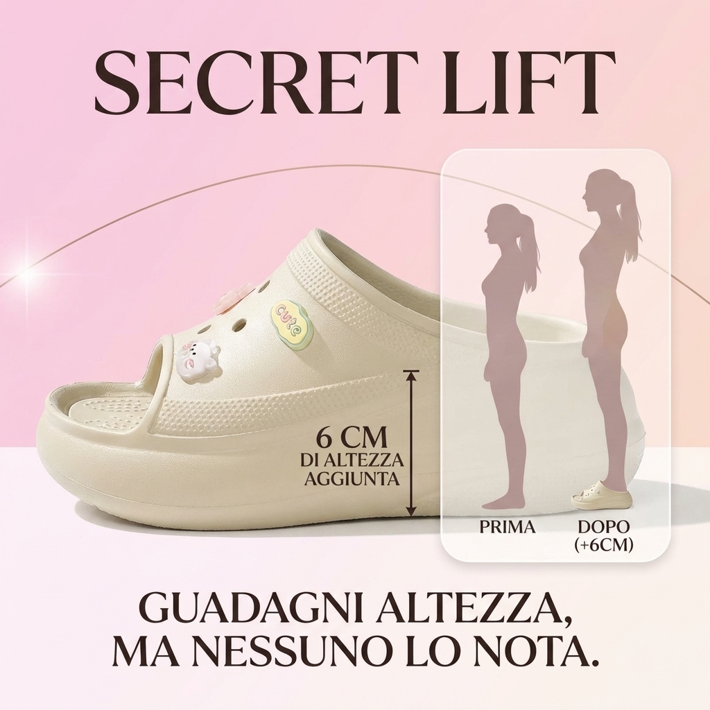 6 cm nascosti nella suola platform. Dall'esterno sono normali ciabatte trendy. Il tuo segreto resta invisibile.