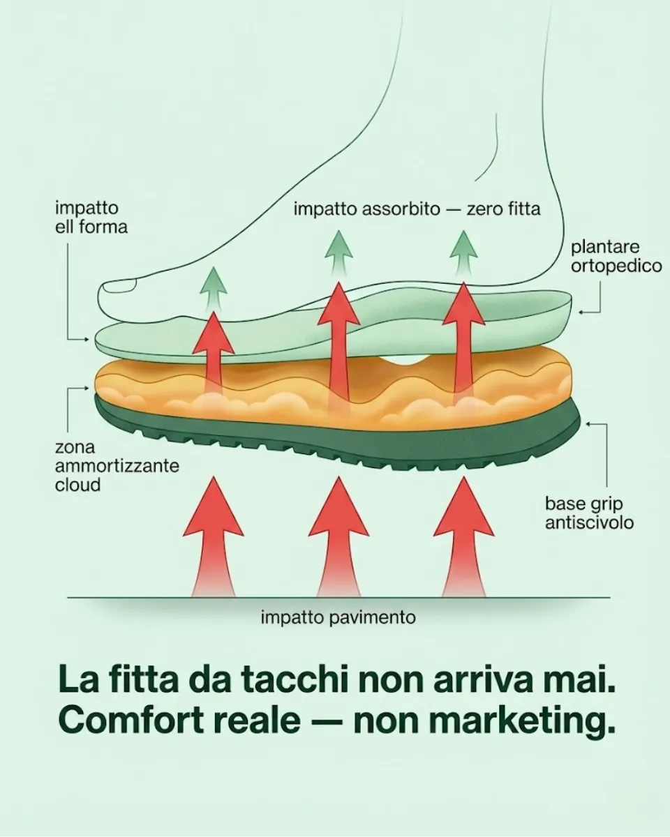 Ho provato ogni tipo di scarpa rialzante — scomode, rigide, e si vedeva sempre il trucco. Le AureaCloud sono diverse. Sembrano delle normalissime ciabatte trendy, le metti e stai subito 6cm più alta. Sono morbidissime, le uso tutto il giorno. Le amiche mi chiedono sempre: "ma come fai a sembrare più alta?" — e io sorrido. Il segreto è tutto nella suola.